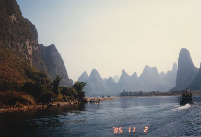 桂林の小高い峰の下を悠々と流れる川。小舟に竿を垂らす人影はまるで杜甫 李白の世界でした。